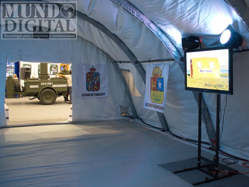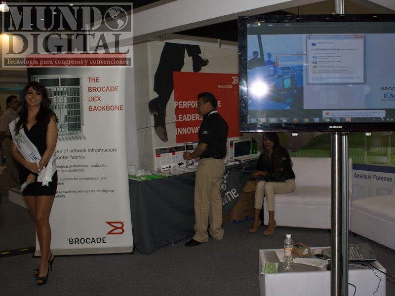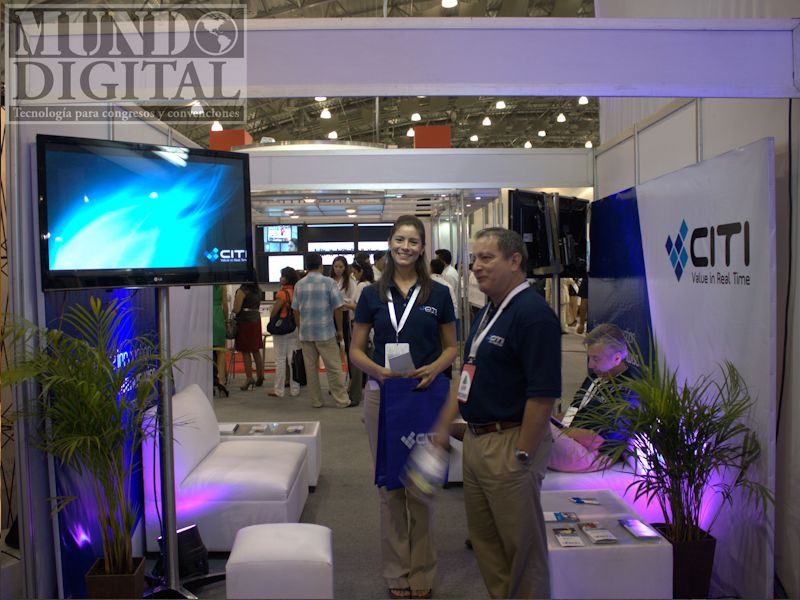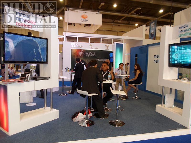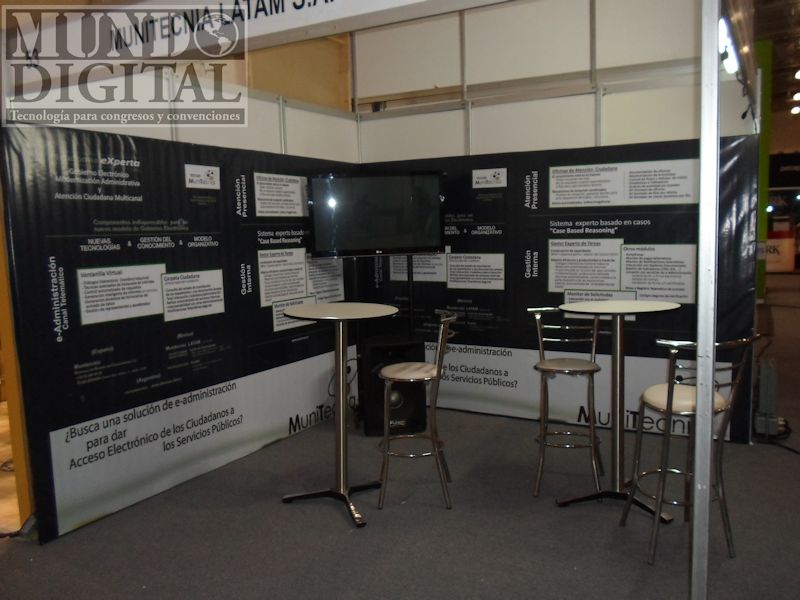 Pantallas de plasma, LCD o LED instaladas sobre la estructura del stand acondicionado para tal fin o sobre bases metálicas ya sea de acero tipo lounge o de metal pintadas en negro